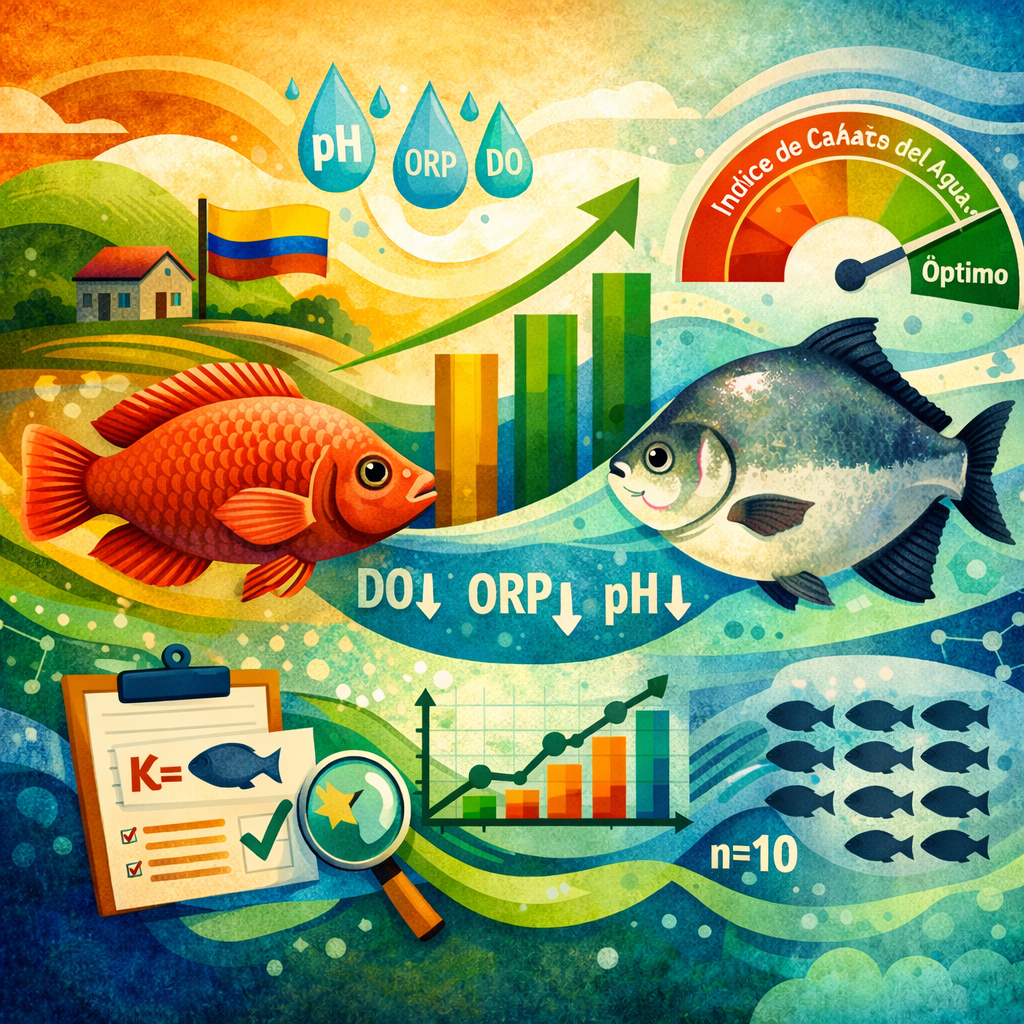 In Colombia, polycultures are an important economic activity for food security and rural development, using together the species red tilapia (Oreochromis sp.) and white cachama (Piaractus brachypomus), this due to their adaptability to different aquatic conditions. Taking into account the knowledge gap in relation to water quality and biometric development of fish, the present study sought to determine the water quality index in polyculture and its relationship with the optimal development of the mentioned species. Four samples were taken, from each sample physicochemical data of the water and biometric data of 10 individuals were collected. It was calculated that there was a significant difference between the 4 samples in terms of physicochemical and biometric parameters, the Fulton condition index (K) was calculated where the cachama with a higher score contributes robustness to the hypothesis of considering a resistant species, the Spearman valuation determines that DO, ORP, and pH negatively affect development; On the other hand, the water quality index showed a considerable progressive improvement in the score, with sample 4 showing the best quality and an acceptable score. It can be concluded that acceptable water quality indices showed a direct positive association with better biometric performance, regardless of the species.