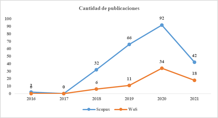 Partiendo de la cantidad de artículos publicados por cada una de las bases de datos se observa como en Scopus las publicaciones sobre la temática de estudio se dan desde el año 2016, pero no es hasta el año 2018 cuando se evidencia un crecimiento significativo con 32 trabajos publicados; tendencia que siguió en ascenso en el año 2020 con 92 publicaciones. Con respecto a Web of Science, es de destacar que, si bien la frecuencia de publicaciones sobre el área es menor, se observa un claro aumento en el área a partir del año 2018.