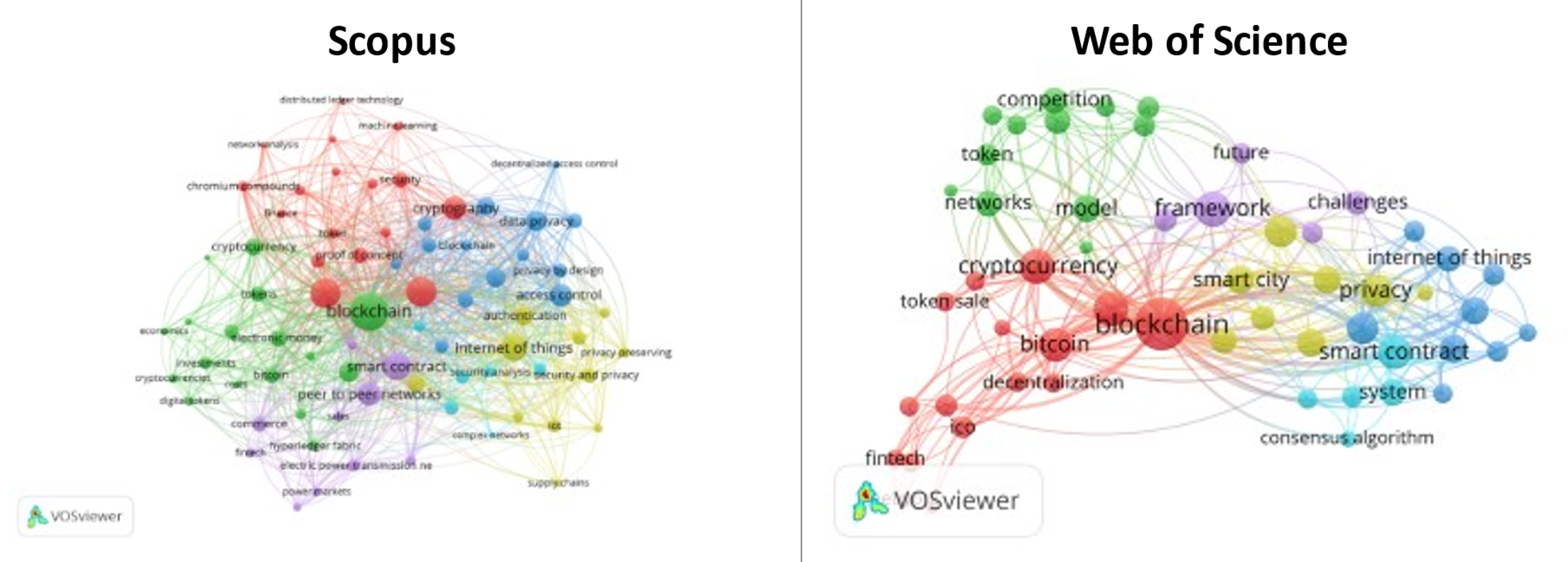 Por otro lado, con respecto a la coocurrencia de las palabras clave localizadas se observa como el base de datos de Web of Science (Figura 1) se evidencia como las palabras clave con mayor impacto son Blockchain, Cryptocurrency, Smartcontract, Ehterium, Security y Bitcoin; dando muestra como dicha temática se ascocia hacia las transacciones digitales apoyadas en la tecnología del Blockchain y los activos digitales como el Etherium o el Bitcoin. Del mismo modo, al realizar la revisión de coocurrencia dentro de la base de datos de Scopus, se observa como aquellas que tienen un mayor impacto son Blockchain, Internet of things, network security, Etherium, smartcontract y Access control, mostrando como se da una relación hacia sistemas informáticos o criptografía: