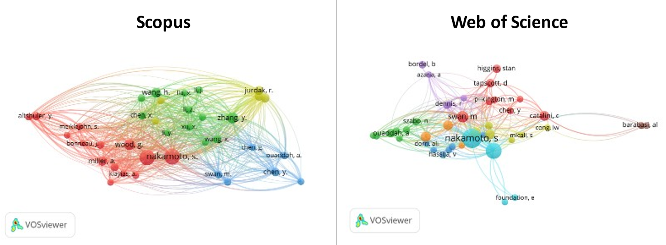 Seguidamente, con respecto al acoplamiento por autor citado se destaca como en ambas bases de datos existen importantes similitudes en los más importantes refetentes dentro del área. Dentro de este mencionado grupo de autores se puede hacer alusión a Nakamoto, S. (referencia utilizada para el seudónimo al cual se le atribuye la creación del protocolo Bitcoin), Chen, Y.; Swan, M. o Quaddah, A. quienes aparecen en las dos bases de datos como algunos de los autores más citados; ello se observa en la siguiente figura: