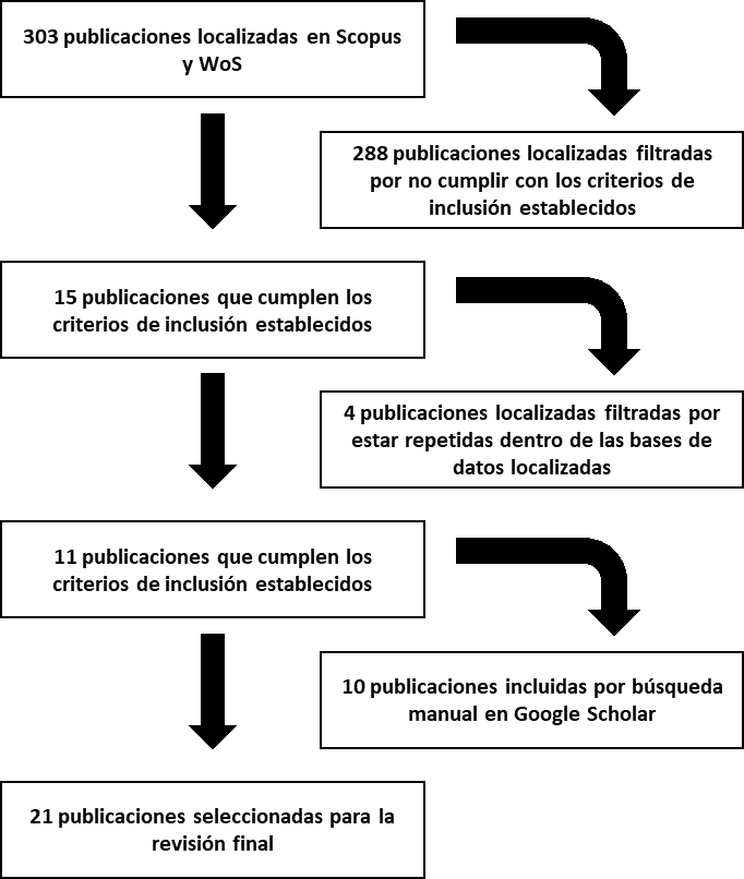 De esta forma, las plataformas seleccionadas para la revisión fueron Scopus y Web Of Science por ser de las dos bases de datos con mayor renombre a nivel internacional y se toman algunos documentos de fuentes de información como Google Scholar los cuales se seleccionan de forma intencional para reforzar ciertos elementos del estudio. La recolección de la información se desarrolla el 24 de junio del año 2021. En este sentido, las búsquedas se realizan con los siguientes criterios de inclusión:
