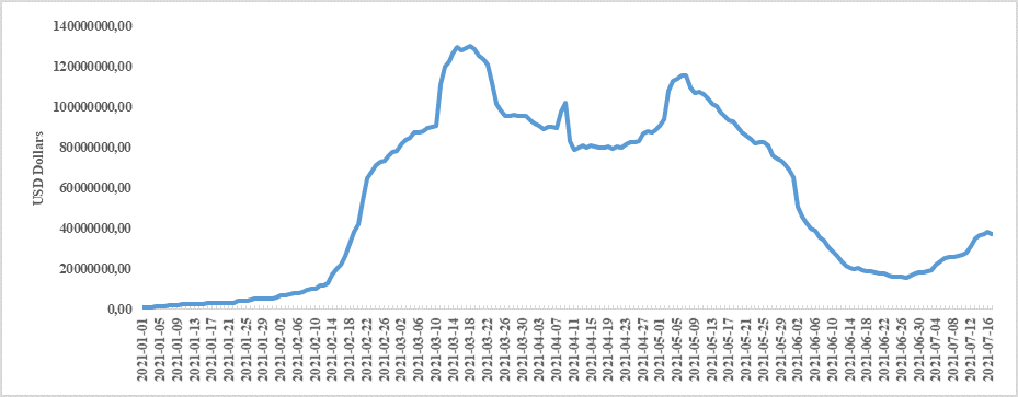 La aplicación de los tokens no fungibles dentro de los sistemas financieros no dista de su aplicación en otros entornos pues básicamente implica la entrada de activos no fungibles dentro de los procesos de intercambio que se dan dentro de los sistemas basados en blockchain (Ante, 2021). De esta forma los Nfts son una alternativa de inversión, que si bien existe desde hace un par de años, no fue hasta hace mucho que mostró un importante crecimiento para así abrir la oportunidad tanto para los creadores de dichos activos como para aquellos que se dedican a su intercambio de crear un espacio propicio para la inversión a mediano y largo plazo (Chohan, 2021; Dowling, 2021a; Dowling, 2021b). Algunos de los ejemplos de los activos basados en tokens no fungibles con relevancia en la actualidad son los cryptokitties o los cryptopunks; sobre estos últimos se muestra la siguiente grafica con el crecimiento en ventas desde el enero 2021 hasta junio 2021: