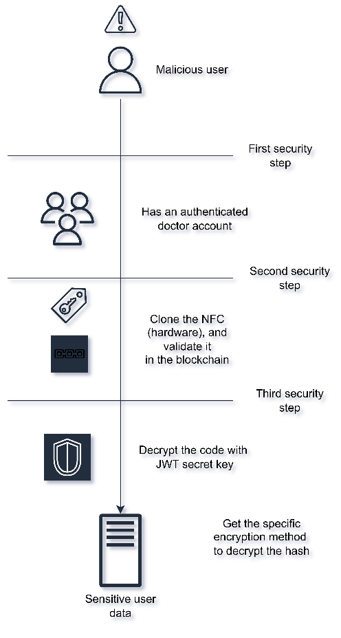 An attacker wants to obtain the sensitive information of a specific patient, this information is in the database. The attacker knows that the identification system works with NFC cards and discovers that these can be easily cloned, so the attacker decides to clone his victim's NFC card.