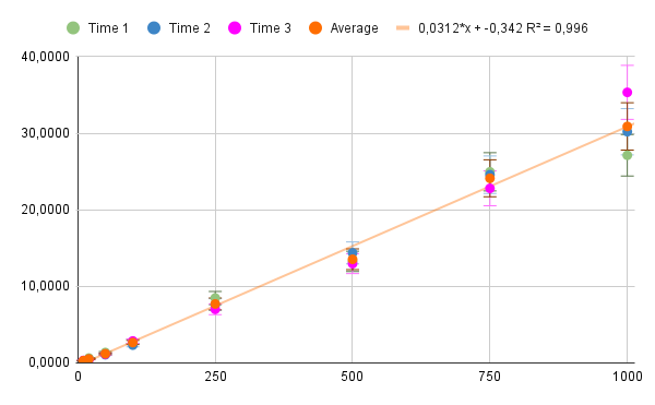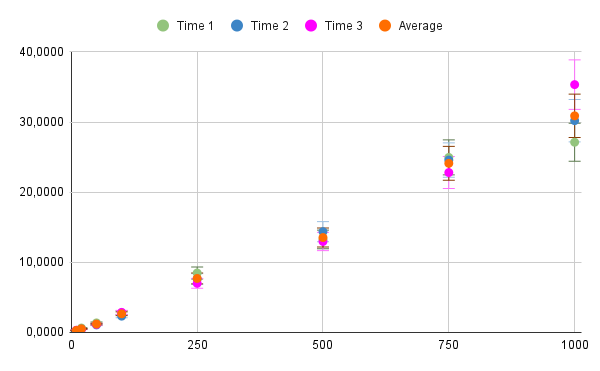 Starting from this scatter plot, which gives a small summary of the times for each amount of data, it is possible to calculate the measures of central tendency and measures of dispersion.