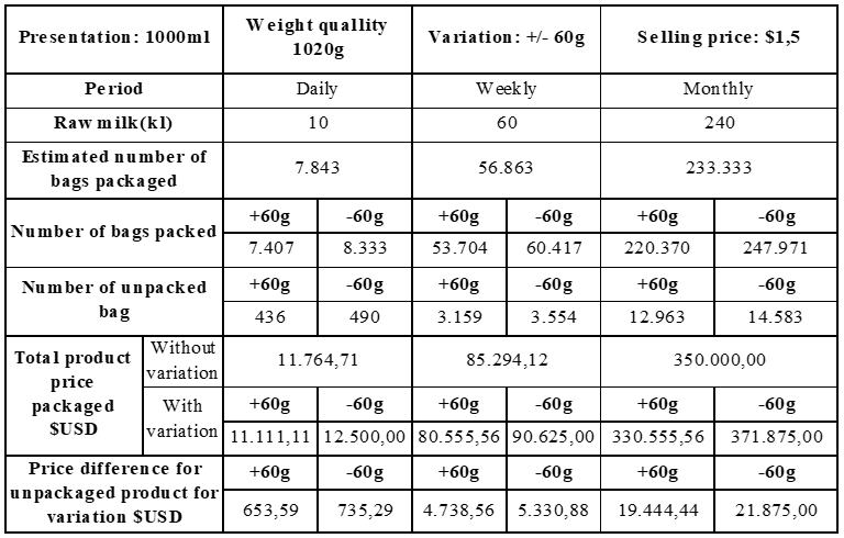 Si se hace una proyección a un periodo de tiempo de 1 mes, en el que se tendría para envasar 240.000 litros de leche cruda de mantenerse en el envasado con una producción estable se tendría un precio de 350.000 USD, 1.47.000.000 pesos colombianos, si se mantiene una producción con la variación de pesos de 60 g, se tendría una pérdida de 21.875 USD, alrededor 91.875.000 COP en promedio.