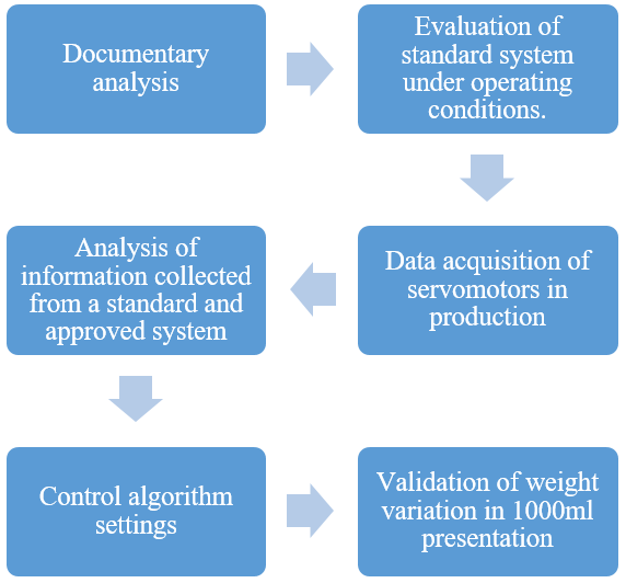 Abstract: The objective of this study was to determine the cause of weight variation of up to 60g in milk bags in an aseptic packaging machine, variables directly related to the weight of the bags were analyzed, leading to the determination that the cause was the horizontal sealing with Festo servo motors, the actuation and synchronization generated by the communication between the PLC and the servo motor controller were identified as the culprit, this system was homologated due to worldwide disruptions in the acquisition of technological equipment, as a result of identifying and correcting the system, a weight variation of +/-3g was achieved in the packaging, which aligns with quality standards, this improvement was attributed to the optimization of routine execution times and data packet transmission times.