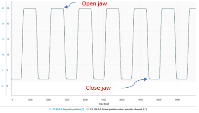 Teniendo como punto de partida el diagrama de tiempo (Fig. 13), se puede tener una perspectiva en las frecuencias en las que se estaría ejecutando la rutina de operación de las mordazas, los valores de los parámetros de control del servomotor, al partir con un tiempo de ciclo de rutina de 100ms.