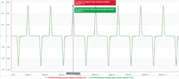 Si se incluye en el análisis los parámetros de operación de motor, como lo es la velocidad se observa un comportamiento semejante, el control que ejerce el controlador sobre el servomotor permite tener un valor aproximado de 266°/s entre el valor real de la velocidad con respecto al setpoint como se observa en la Fig. 9.
