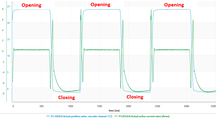 En la gráfica de posición vs corriente (Fig. 12), se puede observar el comportamiento de la corriente del motor cuando cambia de posición, se detalla un comportamiento simétrico en cada periodo de los pulsos generados en pasar de la posición 0° (cerrado) a 25° (abierto), en el que se ve un pico de corriente 2A menor cuando se hace la transición de abierto a cerrado ya que está en su estado de reposo en la que no se genera ningún esfuerzo y se necesita 2 A de más para pasar de cerrado a abierto, dado que necesita pasar de a su máxima apertura y máximo esfuerzo con la carga del motor; pero estos valores están acorde a la corriente pico que puede soportar el servomotor.