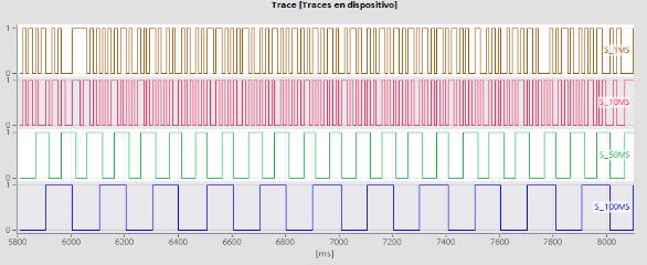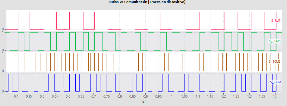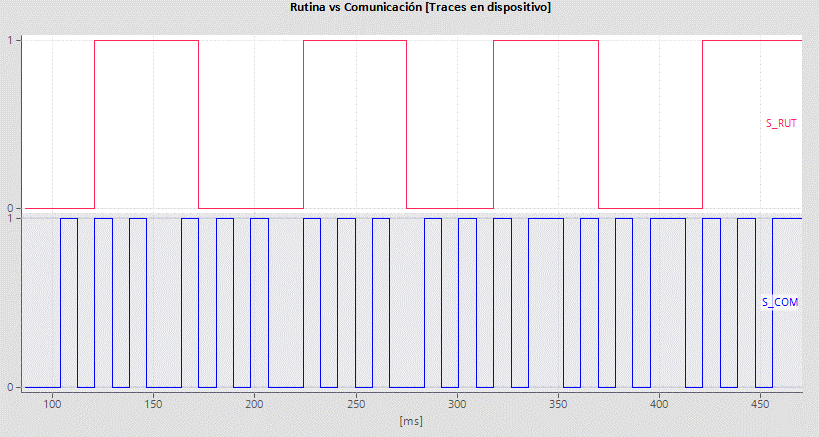 Realizando el comparativo entre los tiempos de ciclo de la rutina y el tren de pulso del intervalo de paquetes solicitados (Fig. 15) donde la actualización de estos datos se vería reflejada de la siguiente manera, Señal Rutina (S_RUT) a 100 ms, Señal a 50ms (S_50ms), Rutina a 10ms (S_10ms) y Comunicación(S_COM) a 20ms. A partir del comportamiento de la gráfica se puede evidenciar que un periodo de ejecución de la rutina permite tener actualizado los datos en el controlador, esto permitiendo obtener 2 valores ya sea igual o diferentes de los parámetros durante 1 ciclo de transmisión.