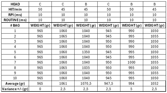Este mismo sistema de sellado horizontal servoasistido con servomotores Festo, se empleó en un segundo cliente que adquirió una envasadora de 4 cabezales para el envasado de diferentes presentaciones de 400ml hasta 1200ml y diferentes producto( leche entera, deslactosada, descremada), por tal motivo se debió garantizar la misma variación de máximo +/-5g de diferencia en las bolsas envasados con producto, por ello se emplearon la mismas configuraciones de rutina y RPI usadas con el cliente #2, en la que se obtuvieron los siguientes muestras: