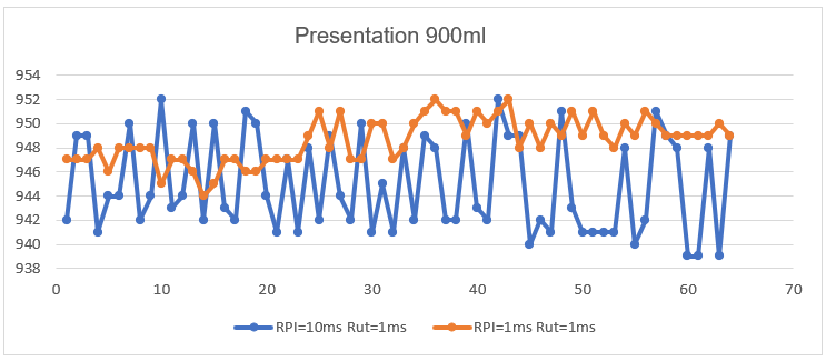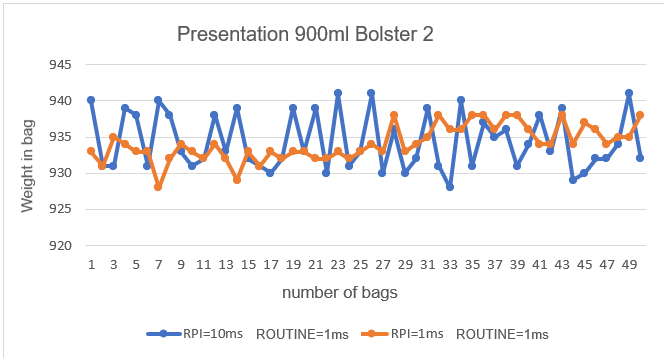 Se puedo observar que para el intervalo de paquetes solicitados de 10ms y un ciclo de rutina de 1 ms (Fig. 17), están más dispersos los datos recolectados cuya rango de pesaje oscilan entre 952 g y 939 g, en el que se tiene una variación de +/-6.5 g, al modificar los tiempos de comunicación entre el PLC y el driver el servomotor a 1ms la dispersión es más pequeña, el comportamiento de los datos las bolsas pesadas tienen a tener valores cercanos entre sí, en la que se obtiene un máximo de 952g y un mínimo de 944g, un promedio 948g, y una variación de +/-4g esto permite estar dentro del rango de calidad del producto.