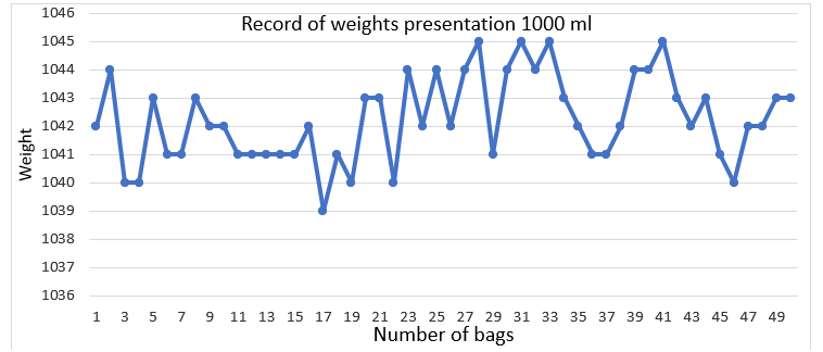 Posterior a ellos se hace un seguimiento aleatorio en la línea donde el personal de calidad verifica tanto el peso como la calidad de sellado de las bolsas, en esta se hace un ajuste al peso en la que mantienen un valor en promedio de 1025ml (Fig. 21).