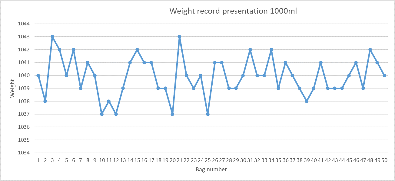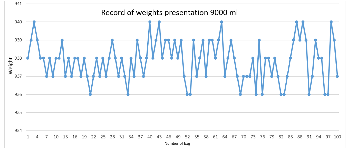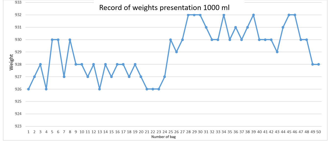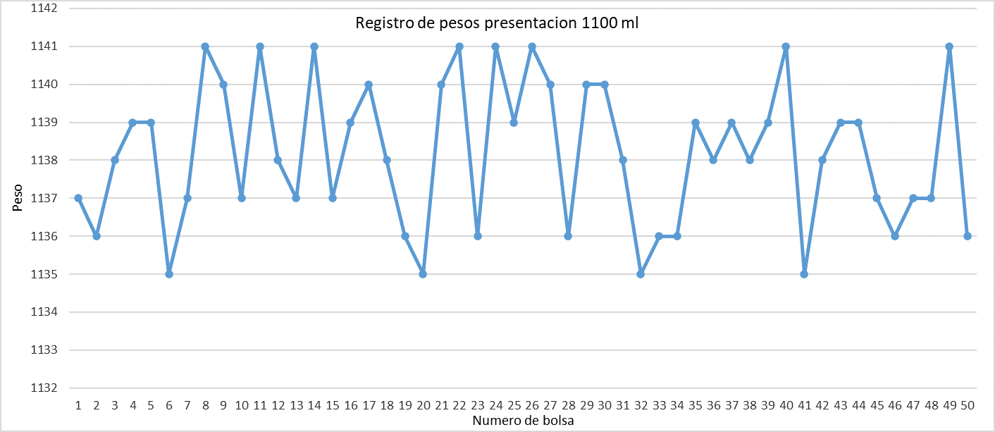 De acuerdo con el comportamiento de los ciclos de trabajo de cada parte, se debe analizar el comportamiento del peso de las bolsas de leche con respecto a estos tiempos por lo obtuvieron una data de peso en la que se tiene el siguiente comportamiento en la presentación de 900ml.