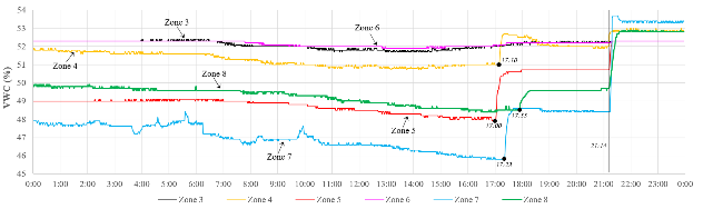 Fig. 8 shows the increasing variation in the VWC by considering the same time instant, which allows understanding the transient water accumulation in the soil. In general, the irrigation time required by each zone varies between 9 and 12 min, and the registration of such a variation can take up to approximately 15 min.