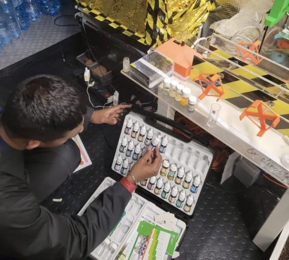 Un sistema hidropónico instalado en el hábitat permite un ambiente adecuado para el crecimiento de las plantas y la germinación de las semillas y podría ser una plataforma disponible para la cosecha en la superficie de otro planeta. El dispositivo estaba equipado con un tanque de agua y dos bandejas, un sistema hidráulico alimentado por una bomba que permite que el agua fluya y mantenga vivas las plantas. La calidad del agua y las condiciones ambientales, como el dióxido de carbono, la humedad relativa y la temperatura, se medían tres veces al día. Además, la química del agua, como pH, nitritos, nitratos, fosfatos, oxígeno, amonio, dureza de carbonato, cobre, hierro, silicato y dureza de carbonatos se midió utilizando un kit de acuario de agua dulce JBL Pro AquaTest Lab (Figura 05).3.2.4 Kombucha