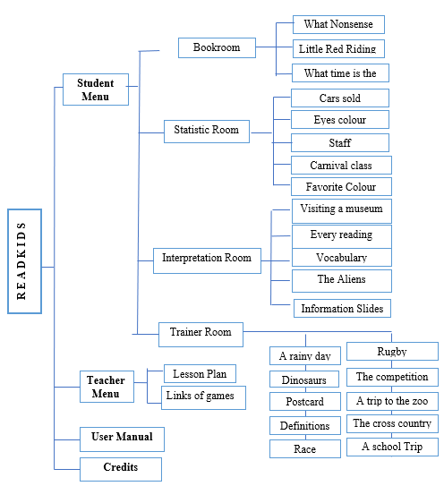Los resultados del diagnóstico permitieron identificar las dificultades de los estudiantes sobre la lectura crítica en inglés y sirvieron como base para diseñar el RED. En la figura 1 se presenta la estructura de los contenidos que conforman el RED, los cuales se dividen en 4 secciones: Menú de estudiantes, menú de profesores, manual de usuarios y créditos. En la sección del estudiante se tuvieron en cuenta las categorías evaluadas en la prueba inicial y se diseñaron 4 unidades, denominadas: “Bookroom”, “Statistic room”, “interpretation room” y “trainer room”.