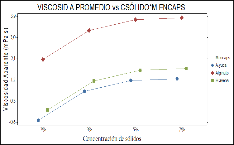 El análisis estadístico de los p-valor<0.05 indican que la viscosidad aparente varía según el material encapsulante, la temperatura de calentamiento y la concentración de sólidos evaluados (ver figura 2).