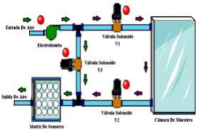Un concepto muy general de la nariz electrónica es la de un instrumento que consiste en un conjunto de sensores electroquímicos con una especificidad parcial y un sistema adecuado de reconocimiento de patrones, capaz de reconocer olores simples o complejos En la Figura 6 se aprecia el sistema de nariz electrónica disponible para el desarrollo de este proyecto, la cual consta de las siguientes partes (Gualdrón et al., 2014):