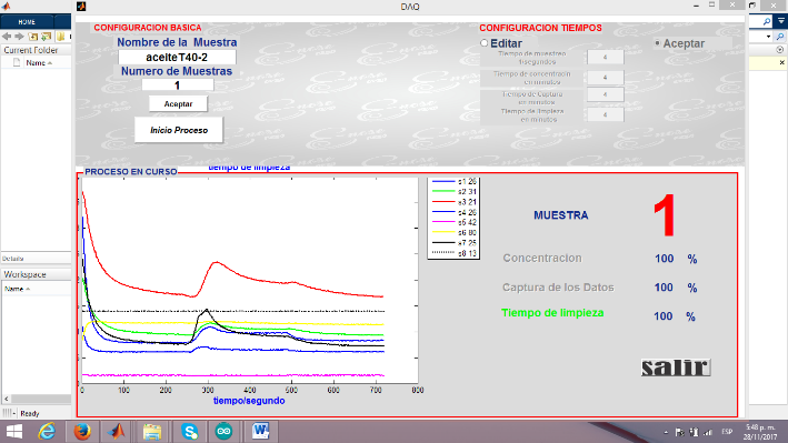 La adquisición de los datos dentro de la nariz electrónica se hizo por medio de una tarjeta DAQ (National Instruments), y el procesamiento de estos se realizaron por medio del software Matlab® 2014b, donde se pudo visualizar la respuesta de cada uno de los sensores cuando se exponía la muestra a diferentes cambios de temperaturas y diferente tipo de muestra, a continuación, en la Figura 7 y 8 se podrá observar la respuesta de los sensores a 30ºC y 40ºC de la muestra del aceite.