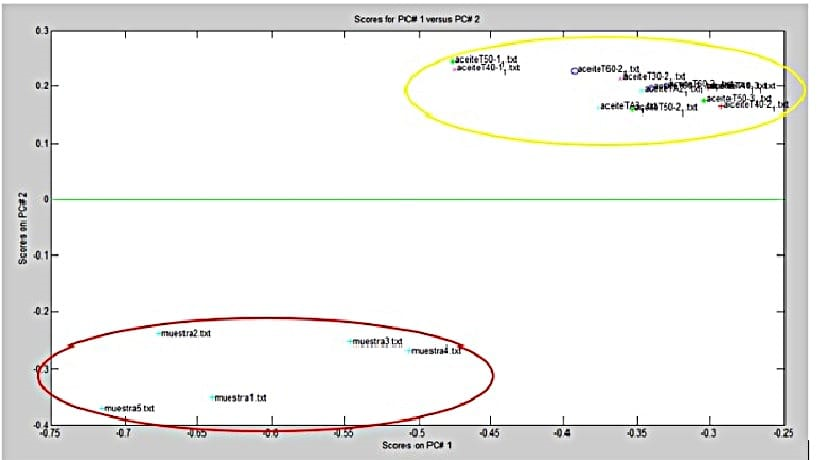 Cuando se ha seleccionado el pre procesado de la data y calculamos según la respuesta de los sensores en cuando a cada una de las muestras, en la figura 10 se podrá observar la debida clasificación, teniendo en cuenta que las muestras tomadas fueron de dos transformadores en diferentes estados, la primera se tomó de un transformador en funcionamiento (muestras encerradas en el color amarillo) y la otra es de un aceite totalmente nuevo (muestras encerradas en el color rojo).