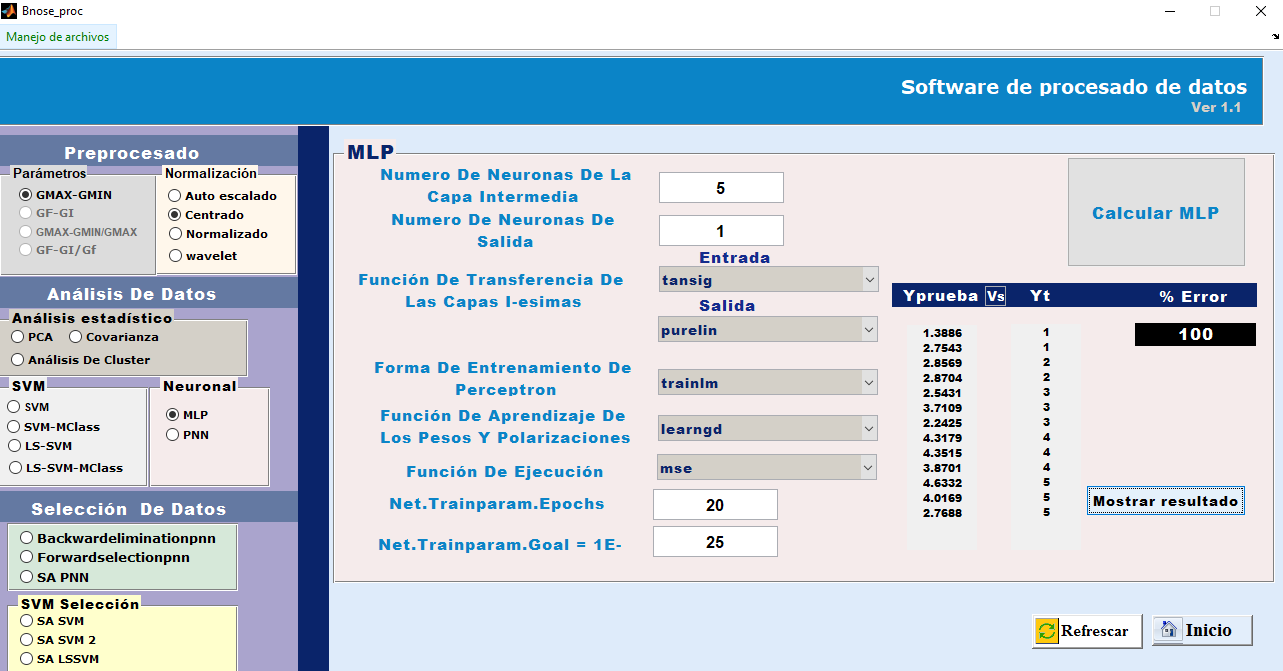 Se establece el entrenamiento de una red neuronal MLP como clasificador para los datos obtenidos a partir de la respuesta de los sensores compuestos en el sistema, pero que son diferentes a los utilizados en la PCA, el método de entrenamiento de la red neuronal será por partes, donde se entrena con una data, y se valida con otra completamente distinta para poner a prueba la robustez del algoritmo obtenido, definiendo como un primer ítem 5 neuronas en la capa oculta y 1 neurona en la capa de salida, con funciones de activación Tansig en la capa oculta y Purelin en la capa de salida, el número de iteraciones programadas antes de volver a correr el algoritmo sin encontrar unos buenos parámetros es de 100. Todos estos parámetros se pueden encontrar en la figura 25, una vez definidos por el usuario, se da la orden de comenzar a calcular la MLP, una vez finalizado el entrenamiento se encuentran los siguientes resultados. (TANCO, 2021)