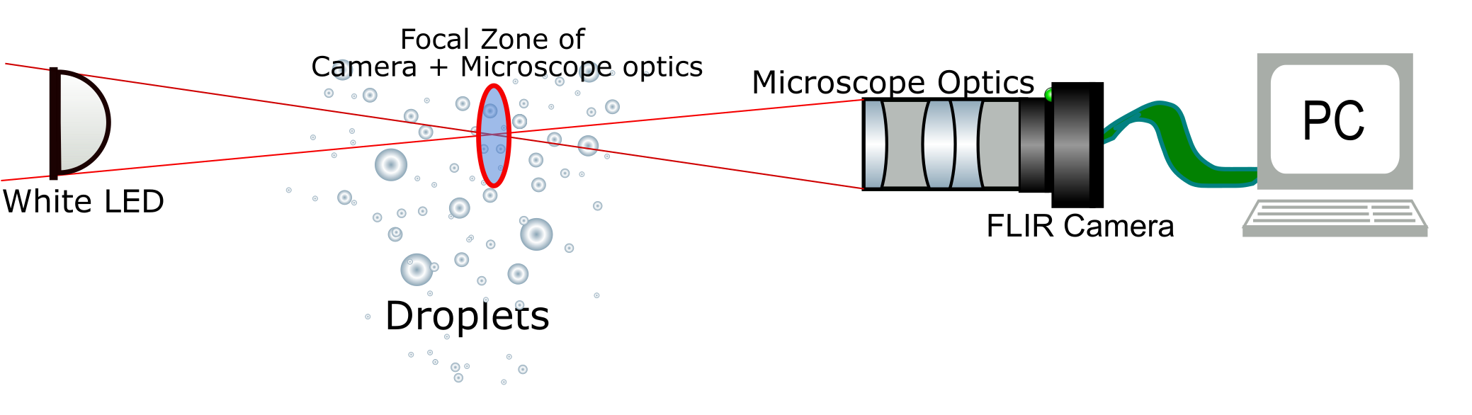 El montaje consistió en una cámara FLIR Flea 3.0 USB, un conjunto de lentes de microscopio con un zoom de 140X y una retroiluminación difusa desenfocada procedente de un LED blanco, como se muestra en la figura 1. De este modo se obtenía un fondo uniforme y no era necesario utilizar la luz estroboscópica, ya que con los ajustes seleccionados de la cámara se obtenían imágenes de alta calidad de las gotas. La cámara tomó imágenes de sombra retroiluminadas de las gotas a una velocidad de 60 FPS y un tiempo de obturación de 0,015 ms. Además, tomó imágenes de sombra retroiluminadas de las gotas a 60 FPS y 0,016 ms de tiempo de obturación. Se tomaron 600 fotogramas para cada configuración para un total de 10 segundos de captura de gotas. Algunos de los resultados se presentan en la figura 2. Se puede observar cómo un mayor tiempo de obturación afecta al movimiento aparente de las gotas, al enfoque individual de las gotas y a la profundidad del nivel de gris. Otros ajustes de la cámara utilizados incluyen una ganancia de 24 dB y el uso de la corrección automática del brillo. Las gotas se produjeron a partir de agua destilada mediante un generador de niebla piezoeléctrico poroso de funcionamiento continuo.