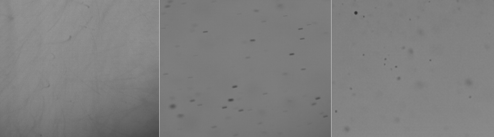 Fig. 2. Comparación de imágenes de sombras de gotas obtenidas de la misma fuente con diferentes tiempos de obturación: 1,6 ms (izquierda) 0,16 ms (centro) y 0,016 ms (derecha)