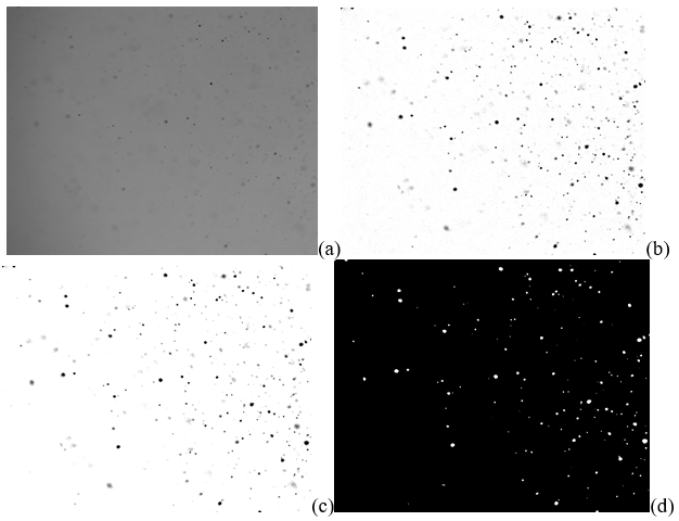 Abstract: This paper synthesizes a procedure performed for counting and measuring the area and diameter of individual droplets generated by a piezoelectric fog generator. A camera-based optical array was constructed to capture images of the water droplets against backlight. Using ImageJ software, the Sauvola Auto-Local Thresholding technique was applied, simultaneously binarizing the focused droplets and discarding the out-of-focus ones. Subsequently, the area and diameter of the droplets were calculated and processed using MATLAB. The results show that the method performs adequately in both binarizing the focused droplets and discarding the out-of-focus droplets in a single step, which resulted in a reliable droplet count with a measurement accuracy of 5 micrometers.