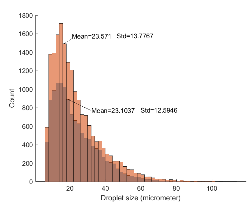 El procesamiento de los datos del archivo .csv que contiene los resultados se realiza en el software Mathworks ® MATLAB en una sencilla secuencia de descarte de gotas inviables, aplicación de la escala de calibración de píxeles a micrómetros y, por último, trazado de histogramas junto con los valores medios y la desviación estándar de los datos del diámetro de las gotas.
