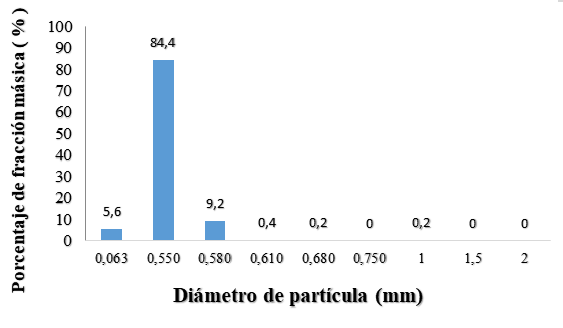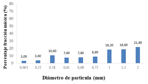 La Figura 1 muestra la distribución del diámetro de partícula de la harina de avena, (84.40 %) con un tamaño de partícula de 0.55 mm, con un diámetro promedio de 0.53 mm correspondiendo a un producto de molienda fina (49, 66). El tamaño de la partícula y la capa superficial de la harina de avena por su alto contenido en fibra alimentaria, influyen en las propiedades fisicoquímicas de la matriz encapsulante que se requiere, favoreciendo la disolución y homogenización con los demás materiales a mezclar. De igual forma se presenta el análisis granulométrico del almidón de yuca nativo (Manihot sculenta Crantz), con una distribución del tamaño de partícula no homogénea, donde el 58.6 % estuvo en el intervalo de 1 a 2 mm y un intervalo promedio de 0.54 mm (41.4 %), para un diámetro promedio de partícula del almidón de yuca de 1.14 mm que corresponde a un polvo de categoría muy fina (Flores-Peña, et al., 2013; CODEX STAN 176. 1989; De Araujo, et al., 2016).