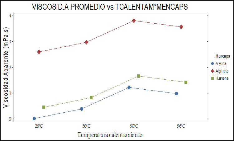 El análisis estadístico de los p-valor<0.05 indican que la viscosidad aparente varía según el material encapsulante, la temperatura de calentamiento y la concentración de sólidos evaluados (ver figura 2).