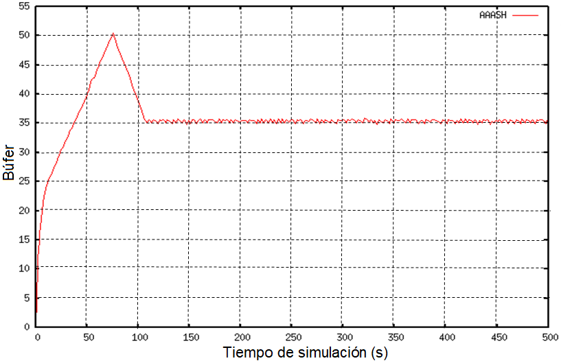 En la Fig. 2, se observa el comportamiento del búfer para el algoritmo AAASH, donde, en los primeros segundos de simulación este incrementa rápidamente hasta alcanzar un valor aproximado de 25 s de búfer durante los primeros 10 s de reproducción, luego alcanza un valor de 50 s de búfer entre los 1 s y los 70 s de reproducción, posteriormente desciende a los 35 s de búfer en los 110 s de reproducción, cuyo valor permanece estable observándose un rizado en su comportamiento.
