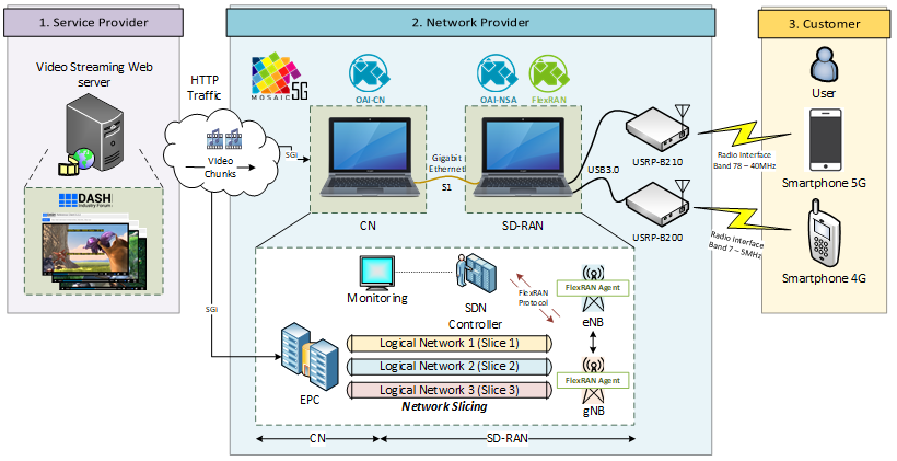 To manage the client-server communication and content distribution, a mobile network based on the 5G NSA architecture is implemented in the network provider domain. The elements that make up the CN and SD-RAN modules at the software level have been built using open-source tools. To do so, the Mosaic-5G software platform