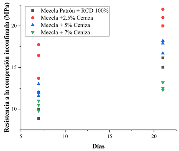En la figura 6 se observan los resultados de la resistencia a la compresión inconfinada de los cilindros con 0% de RCD hasta el 100% de RCD como sustituto del agregado grueso.