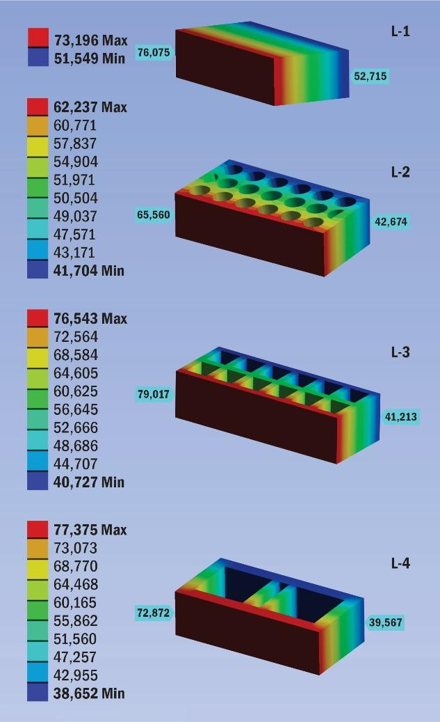 diferentes tipologías de ladrillo, donde, L-4 demuestra un mejor comportamiento térmico con un perfil de