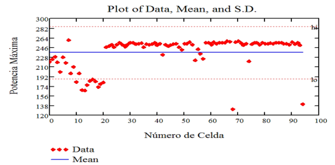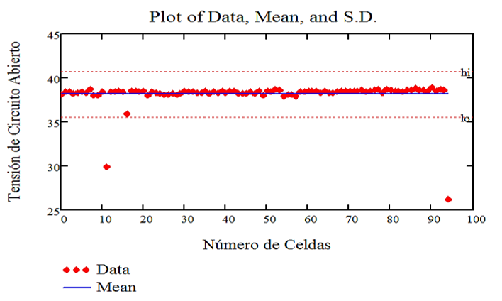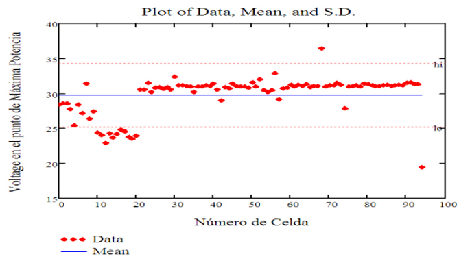 Fig. 9 Graphic Representation of the Measurements of the Voltage at the Point of Maximum Power with its Respective Mean Value and Errors