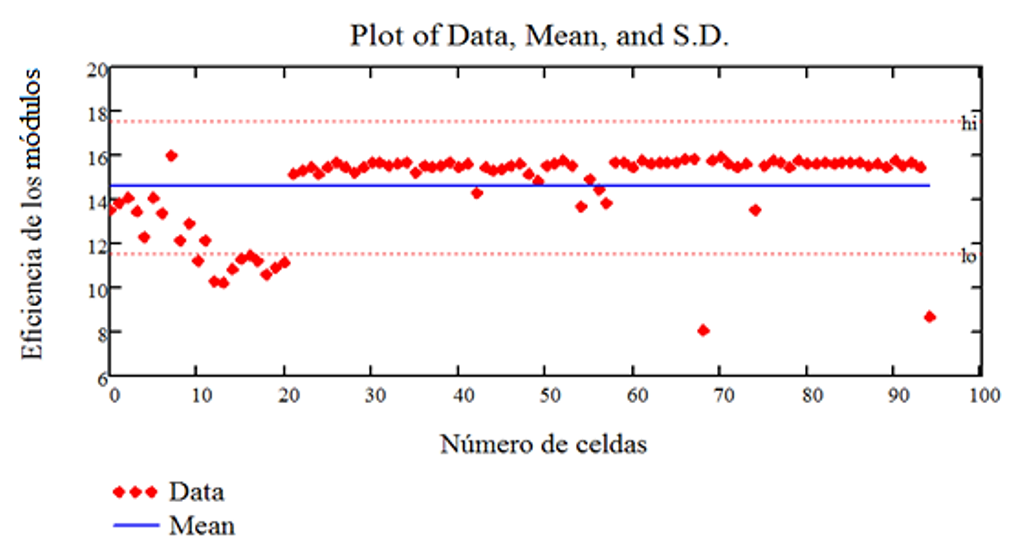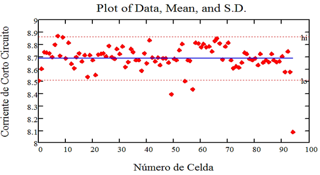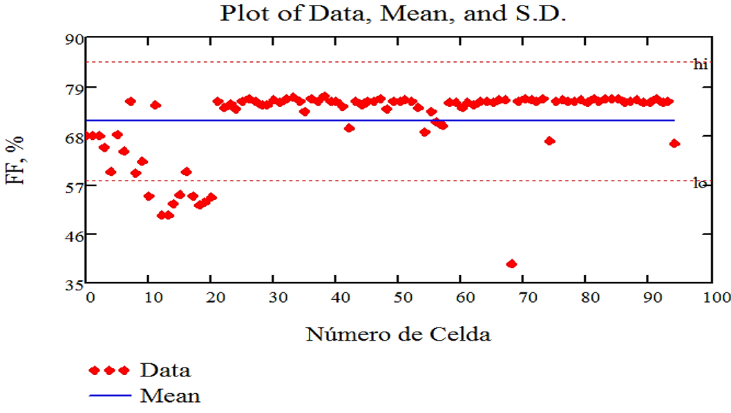 Below are scatter diagrams for the main electro-optical parameters of the 95 photovoltaic solar cells studied with their mean values and their