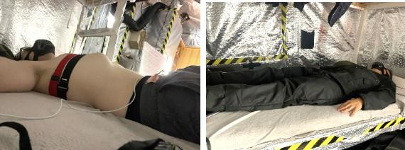 La respuesta fisiológica a temperaturas extremadamente bajas se probó en el Centro de Crioterapia de Cracovia, estos datos se recopilaron mediante una banda con un multisensor que se coloca en el pecho para la adquisición de ECG, aceleración 3D, velocidad angular, presión barométrica del aire y temperatura (ECGMove4, Movisens Gmbh, Alemania). Después de un examen médico y 2 minutos de calibración de los sensores, los tripulantes análogos fueron expuestos a un baño de nitrógeno líquido durante dos minutos a -120ºC