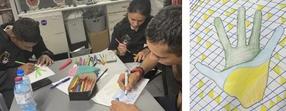 El reflejo emocional de la tripulación no solo era visible en los informes diarios, sino también en una tarea especial de dibujo llamada Space Dragon (Figura12). El dibujo reflejaba el estado real de un tripulante análogo que indicaba ambientes interiores y exteriores. El dibujo consistía en dibujar el mapa de su mano y en el interior de ella dibujar como el tripulante se percibía a sí mismo y en la parte exterior como cree que el mundo exterior tiene una percepción del tripulante, este dibujo debía ser explicado ya que todo lo plasmado tenía un significado para cada tripulante análogo.