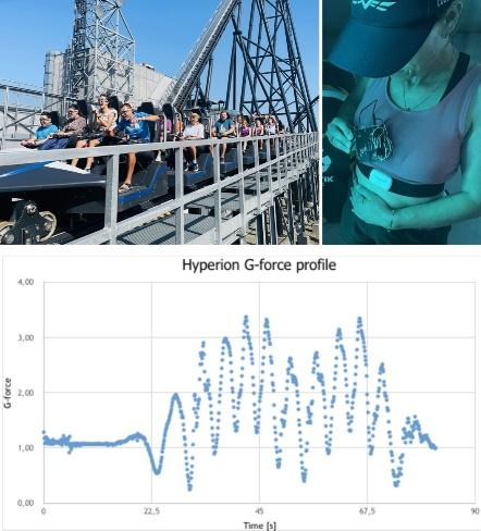 Se registraron datos obtenidos de los miembros en el exterior, respecto a experimentar fuerza G y aceleraciones en diferentes montañas rusas (ubicadas en Zator, Polonia), para la obtención de estos datos, se usaron equipos como acelerómetros de Arduino adicionales y los sensores movisense. La longitud de una de las montañas rusas es de 1500 m, 77 m de altura y una velocidad de 142 km/h, una fuerza G de 4,8 según la base de datos de la montaña rusa (https://rcdb.com/14462.htm), los sensores estaban dispuestos en el pecho de cada miembro y como resultado previo se evidencia que el resultado de estos miembros reveló fuerzas G más bajas (max 3.5) en comparación con la información disponible en internet (Figura 16)