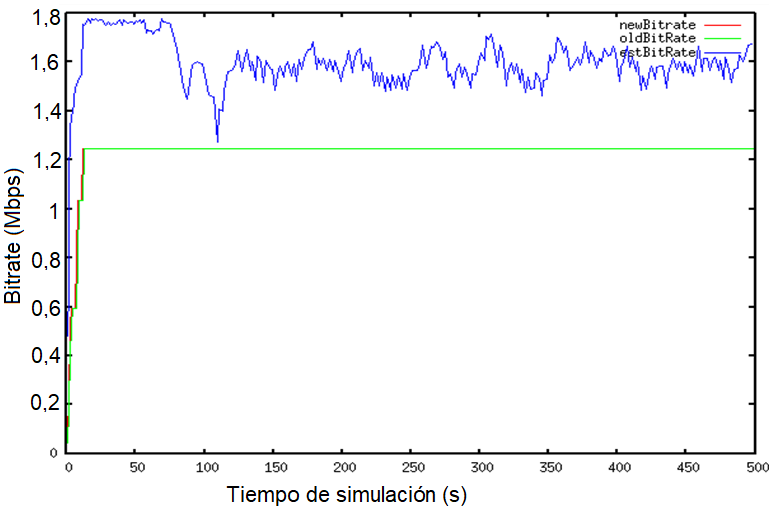 El tiempo de simulación es de 500 segundos que es suficiente para evaluar el comportamiento del servicio sobre el protocolo AAASH. En la Fig. 1 la curva denominada NewBitrate y OldBitrate representan la tasa de bits del usuario en dos instantes, según como trabaja el algoritmo AAASH. El rendimiento no corresponde a una resolución en particular, puesto que lo que hace el algoritmo es cambiar las resoluciones con tal de mantener precisamente el rendimiento el cual corresponde a la curva denominada estBitRate. Donde el rendimiento del segmento se calcula en el cliente y corresponde a un cociente entre un producto y una diferencia. El producto se obtiene multiplicando la tasa de bits del segmento por su tiempo de duración, mientras que la diferencia se obtiene, restando el tiempo en el que todo el segmento ha sido recibido por el cliente menos el tiempo en que el segmento inicia la descarga. Respecto al rendimiento se observa que el protocolo requiere 12 segundos para estabilizar la taza de bits en 1,21 Mbps.