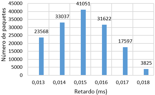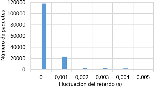 La fluctuación promedio del retardo de acuerdo a la documentación de NS-3 y su FlowMonitor se calcula mediante el cociente entre el jitterSum y los paquetes recibidos menos uno (rxPackets) cuyos valores se observan en la Fig. 3. Así, una vez realizados los cálculos se obtiene que, el valor de la fluctuación promedio es de 0,51 ms, es decir que la mayoría de los paquetes muestran un valor de fluctuación del retardo cercano a cero como se observa en la Fig. 5. En la Fig. 5 se observa el comportamiento de la fluctuación del retardo asociado al número de paquetes recibidos cuya suma coincide con el valor de los paquetes recibidos (rxPackets) de la Fig. 3. En la Fig. 5 no se observa una barra para la fluctuación del retardo de 0,005 s por la escala del número de paquetes y ya que dicho número de paquetes asociado a este valor es de apenas 16.