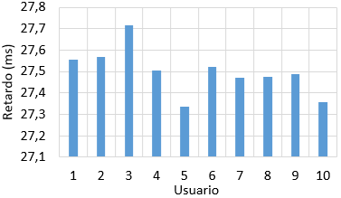 En la Fig. 7, se observa el retardo para cada uno de los 10 usuarios, dicho parámetro representa el valor promedio de los flujos de cada uno de los usuarios. El usuario 3 es quien presenta el mayor valor con 27,7 ms y el usuario 5 quien presenta el menor valor con 27,3 ms. Por tanto, el retardo que presenta cada uno de los usuarios para este escenario es muy similar. Además, de acuerdo a la Tabla 1, el retardo para el escenario II, cumple con los parámetros de QoS.