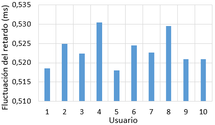 En la Fig. 8, se observa la fluctuación del retardo promedio para cada uno de los 10 usuarios. El usuario 4 presenta el mayor valor de fluctuación de retardo alcanzando los 0,53 ms. De acuerdo a la Tabla 1, la fluctuación del retardo para este escenario cumple con los parámetros de QoS.