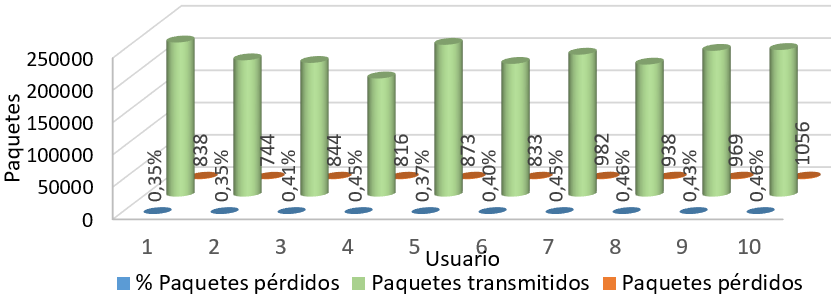 La Fig. 9 presenta el porcentaje de paquetes perdidos, paquetes retransmitidos y paquetes perdidos. Así el usuario 10 es quien necesita se le retrasmitan el mayor número de paquetes cuyo valor es de 1056, sin embargo, este número de paquetes apenas representa el 0,46% de los mismos. Mientras que, por ejemplo, al usuario 4 se le retrasmiten apenas 816 paquetes, pero representan el 0,45% de los paquetes. En todo caso, de acuerdo a la Fig. 9 el número de paquetes que cada usuario necesita que se le retrasmitan es inferior al 1%, por lo que cumple con el parámetro de QoS de acuerdo a la Tabla 1.