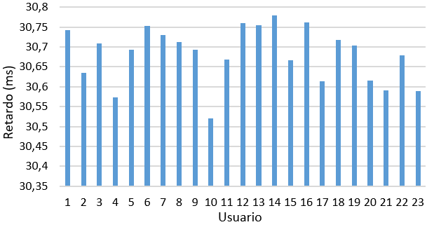 En la Fig. 10, se observa como el retardo para 23 usuarios se ha incrementado en cada uno de ellos. En el peor de los casos se ha incrementado un 3,4 ms respecto al escenario con 10 usuarios. Así, se observa que el menor valor es de 30,52 ms para el usuario 4, mientras que el mayor valor es de 30,77 para el usuario 14. Por tanto, el retardo que presenta cada uno de los usuarios para este escenario es muy similar. Además, de acuerdo a la Tabla 1 el retardo para este escenario cumple con los parámetros de QoS, ver Tabla I.