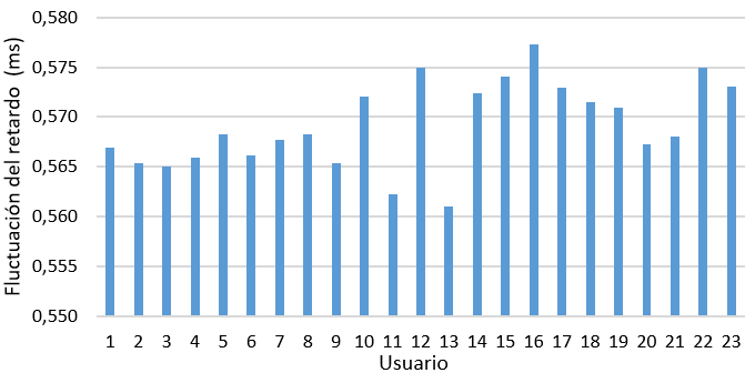 En la Fig. 11 se observa la fluctuación del retardo para cada uno de los 23 usuarios, el cual se ha incrementado en todos los usuarios. En el peor de los casos se ha incrementado 0,05 ms respecto a los valores presentados para 10 usuarios. El valor máximo lo presenta el usuario 16 con un valor de 0,582 ms. De acuerdo a la Tabla 1, la fluctuación del retardo para este escenario cumple con los parámetros de QoS, ver Tabla I.