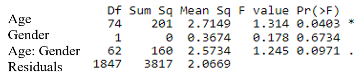 Fig. 3. Analysis of variance for age, gender and interaction factors with respect to blood pressure.