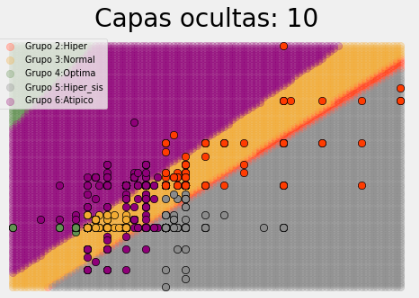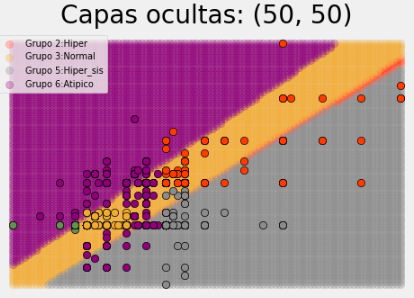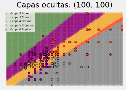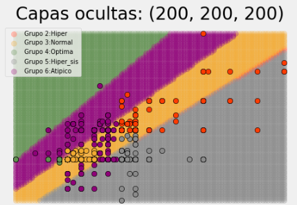 It can be seen that of the models the one that best fits the behavior of the data is model 3 with two hidden layers with 100 neurons each; model 1 and 2 tend to leave blood pressure groups unclassified. Model 4 of three hidden layers with 200 neurons does not show much improvement in classification with respect to model 3 and does consume more resources for its execution, along with classification time; the latter model has an accuracy of 87%.